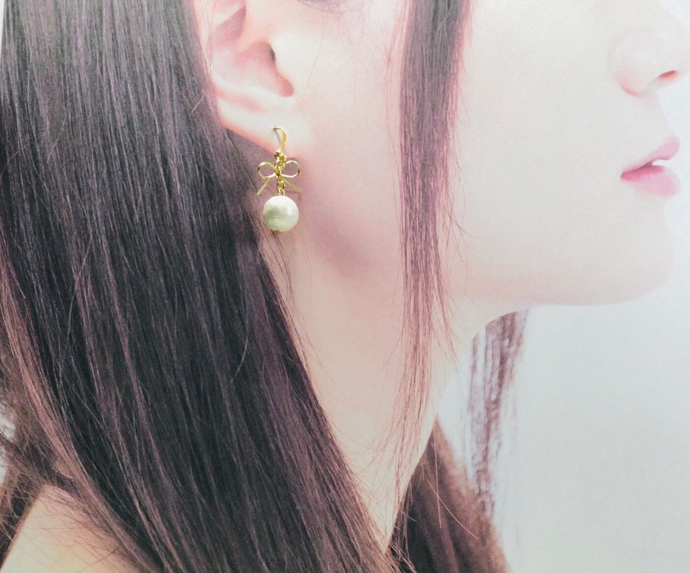 小さなワイヤーリボンとコットンパールがゆらゆらと揺れるピアスです。