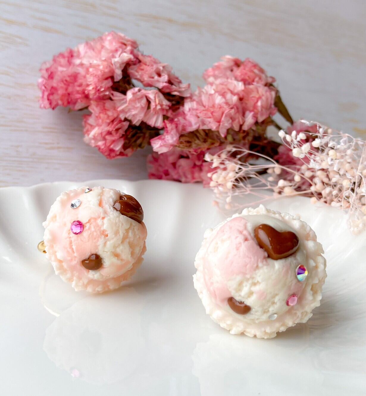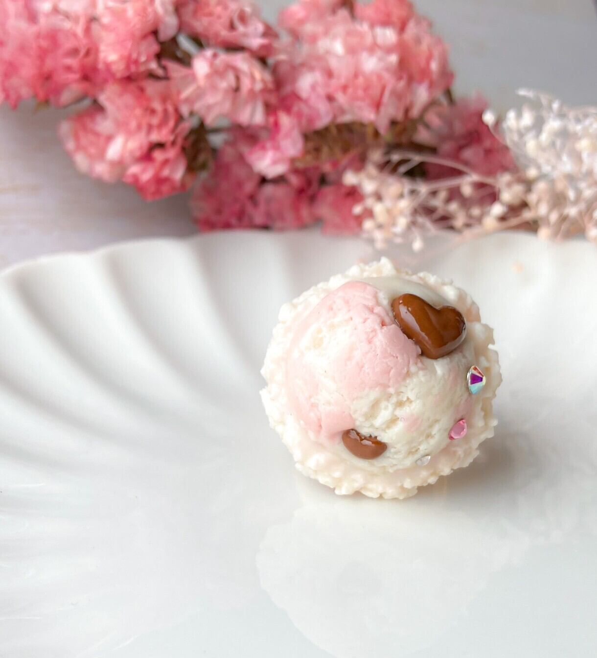 ハート型のチョコレートを埋め込んだ、いちごとバニラのマーブルアイスです。